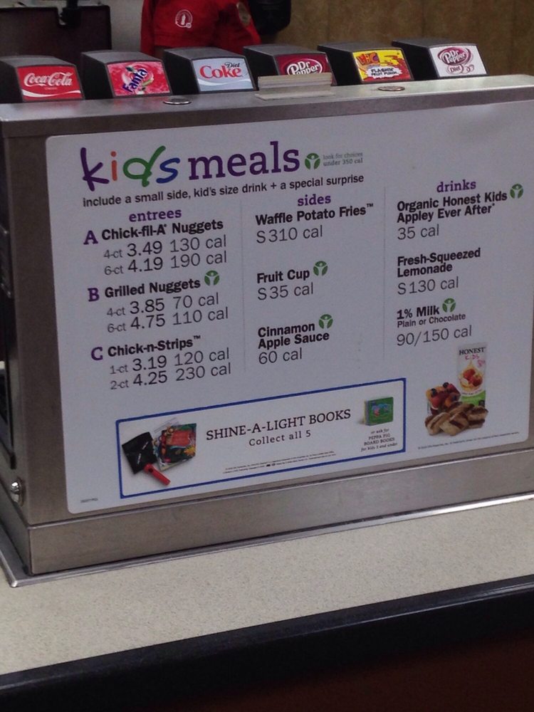 Includes a 4-count or 6-count of Chick-fil-A- Nuggets, a choice of a small Side Item (Cinnamon Apple Sauce, Waffle Potato Fries-, or Fruit Cup), milk or juice, and a special surprise.